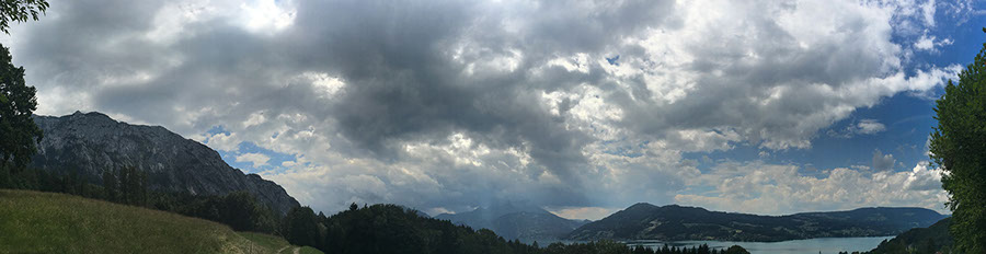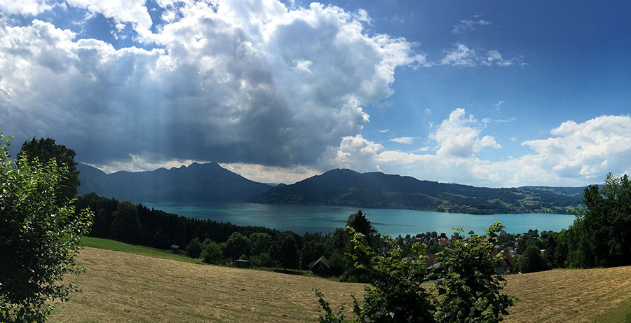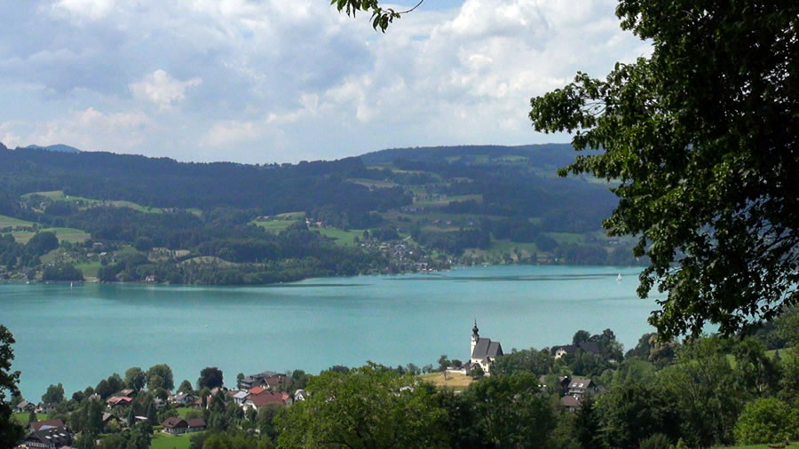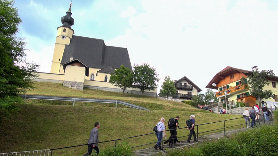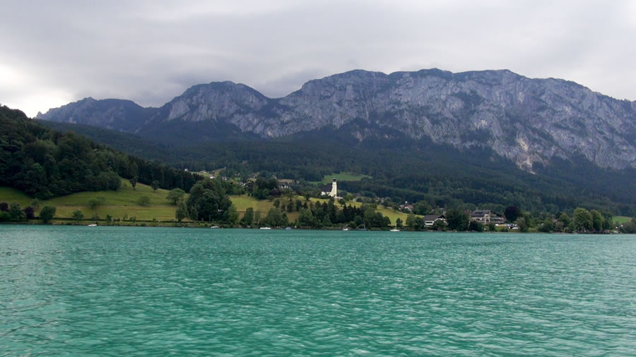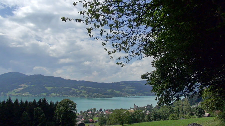Nun setzt sich das MS Gustav Mahler in Bewegung und überquert den Attersee in Richtung Weißenbach. Dort ist beim Hotel Post der Ausgangspunkt für die Erlebniswanderung. Hier zieht die Kirche im Zentrum von Steinbach vorbei. Der Regen hat aufgehört! Der Himmel sieht noch etwas bedrohlich aus…