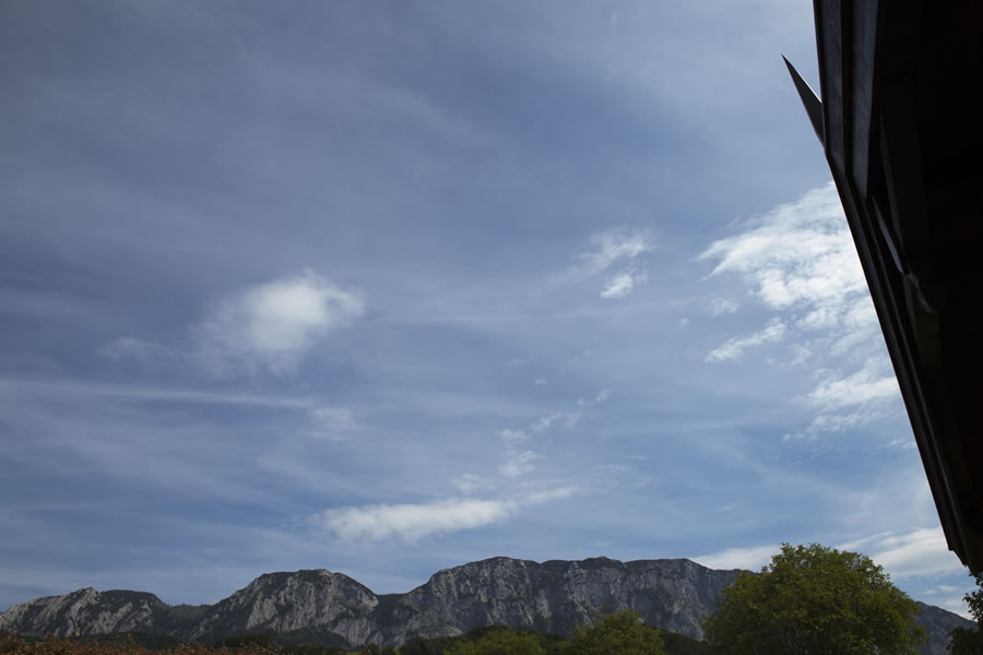 Neben dem Giebel des Häuschens ist das Höllengebirge zu sehen ...