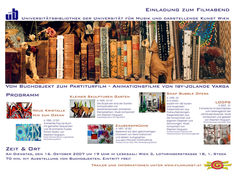 Herzliche Einladung zu einem Abend mit Animationsfilmen von Iby-Jolande Varga In der Universitätsbibliothek der Universität für Musik und darstellende Kunst Wien, am Dienstag, den 16. Oktober 2007 um 19 Uhr, im Lesesaal: Wien 3, Lothringerstraße 18, 1. Stock. 70 min. mit Ausstellung von Buchobjekten, Eintritt frei! Das detaillierte Programm ist weiter unten zu finden. In den Animationsfilmen von Iby-Jolande Varga spielen Bücher, Partituren und Zeitgenössische Musik eine wesentliche Rolle. Um dem Veranstaltungsort an der Musikuniversität Rechnung zu tragen, sei hier ein kleiner Einblick in die musikalische Welt der Filme gegeben. Die meisten Filme sind mit Kompositionen von Stephen Ferguson vertont, welche direkt für sie entstanden sind, lediglich die ersten beiden Filme „Neue Kristalle" und „Hin zum Ozean" (1990) wurden auf seine bestehende Musik „Piano Music: Harmonizer" (1988, erschienen bei Extraplatte) geschnitten. Im Film „Kleiner Skulpturen Garten" (1995) machte Ferguson die Klang-Welt von Iby-Jolande Varga zum Rohmaterial für seine Komposition: Von ihr gesammelte Naturgeräusche, Arbeitsgeräusche - Holzbearbeitung, Kamera -, Interviews mit ihr, ihr Singen. Flüstern, Pfeifen, Klatschen..., ihr Klavierspielen.... „Soap Bubble Opera" (1999) wiederum, ist mit 23 Minuten eine wahre Oper des Animationsfilmes - in 3 Akten zu 14 Szenen. Von der zeitgenössischen 'E-Musik' kommend, hat Ferguson viel praktische Erfahrung mit der Komposition von Gebrauchsmusik, die er hier in lustvoller Weise künstlerisch einsetzen, auskosten, und in einer Synthese mit seiner ureigenen Musiksprache überhöhen konnte. Trailer und nähere Informationen zu den Filmen und zu den Künstlern unter www.filmkunst.at |