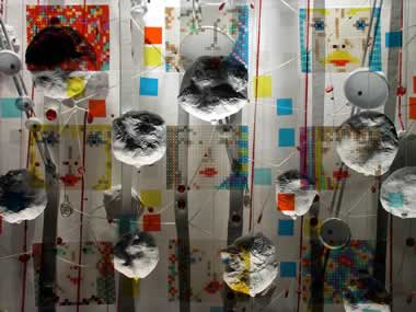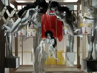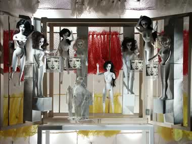 | 14. MÄRZ 2005 Dreh Punkt 9: Recycling City Hintergrund. Mit den Channelhopping-miniTVs auf 2 Bahnen. Dazu muß noch eine Naheinstellung auf nur einer Bahn als Ergänzung hinzukommen. Sequenzen für Windowshopping und für Virtual Pets, teilweise auch verworfen. Beide auf 2 Bahnen. |