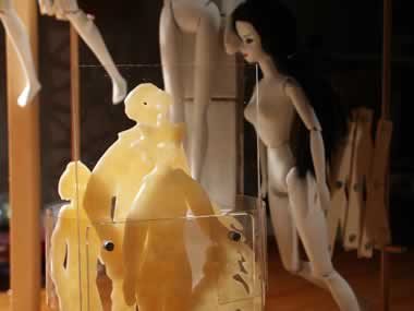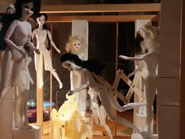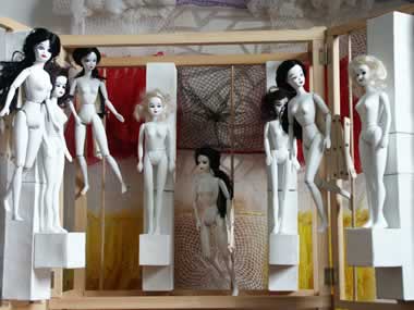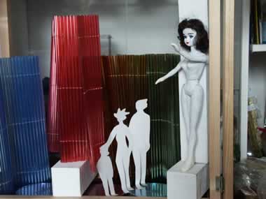| 3. NOVEMBER 2002 UNTEN: Mehr Arbeit als erwartet - die Mannequins - neu modellierte Hände und Füße, zweifach grundiert, neu aufgemalte Gesichter und unter den dunklen Haaren dunkel gemalte "Kopfhaut". Rechts die voll beweglichen Puppen gut für ein freies Tanzen innerhalb des Bildes bei der Animation, hier grundiert und zum Trocknen über dem Ofen auf der Leine. Links skizzenhaft aufgestellt. Sie werden in WINDOWSHOPPING für die Welt der Auslagen stehen, symbolisch und im Vergleich zu den Windowshoppern riesenhaft. |