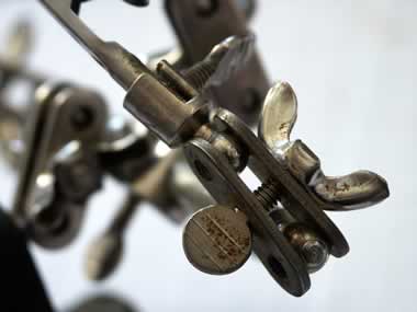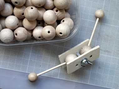 2. VIRTUAL PETS: UNTEN: Alle Eisenwarenhandlungen habe ich abgesucht nach solchen Kugel-Gelenken, wie sie auf der "Dritten Hand mit Lupe" zu finden sind - vergeblich. Beschließe nun kurzerhand für VIRTUAL PETS aus großen Holzperlen, Holzbrettchen, Plastikschrauben und Holzstangen einige selbst herzustellen. Rechts ein unausgearbeiteter Prototyp. |
