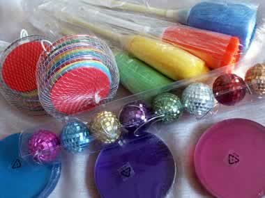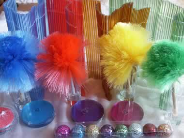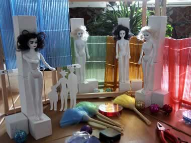 UNTEN: Gesammelte Mannequins, links in allen Gelenken beweglich. Spiegelkugeln in allen Farben, bunte Staubwedel, den roten fand ich vor kurzem als farbliche Ergänzung. Plexiglas-Untersetzer. |