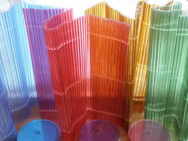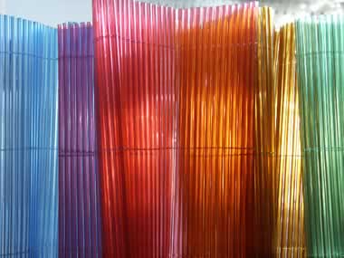 UNTEN: Tischsets aus bunten Plastikrohren. Man kann sie wunderbar als "Raumteiler" einsetzen, durch die Rohre beweglich und leicht in Scharniere zu verwandeln mit eingesteckten Stäben. |