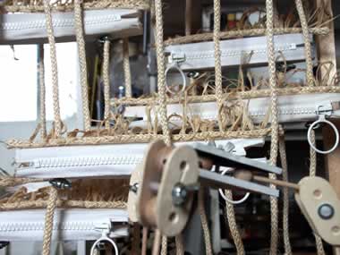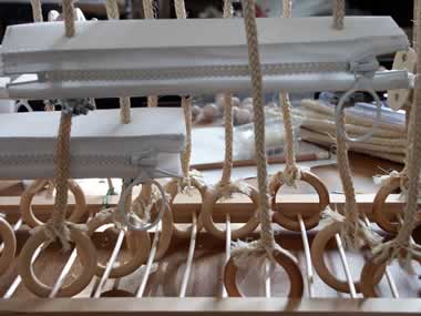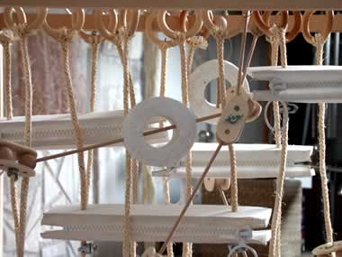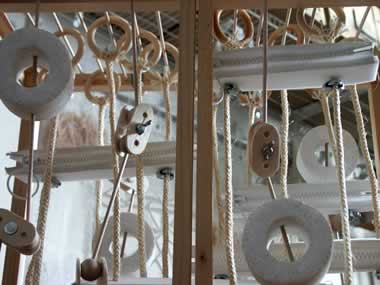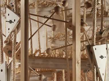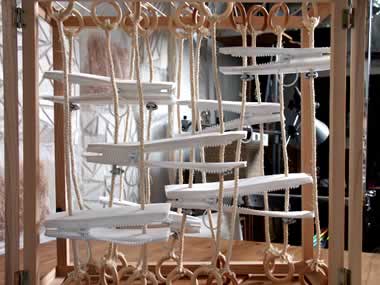 | 6. FEBRUAR 2003 UNTEN LINKS: Nach einigen Ergänzungs-Einkäufen - Holzstäbe, Seilklemmen - die Befestigung. UNTEN RECHTS: Skizzenhaft die Kugelgelenk-Teile angeordnet (in den Türflügeln und an der Rückseite). |