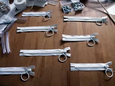 | 1. FEBRUAR 2003 Es braucht etwas Distanz, für Virtual Pets die richtige Form zu finden. Die neuen Pläne sind - wie nicht anders zu erwarten... - wesentlich abstrakter, als die erstan Skizzen von oben. 2. FEBRUAR 2003 UNTEN: Alles wieder zerlegt. Vor allem möchte ich alle 7 Zippverschlüsse unterbringen. Links aufgelegt, rechts aufgenäht und aufgelegt. |