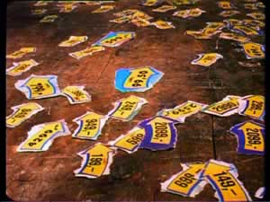 Bambus, Preisschildchen und Sprechblasen, gerissen, teilweise kaschiert
