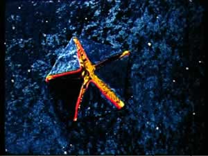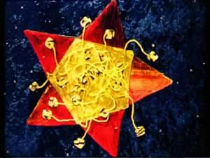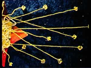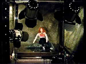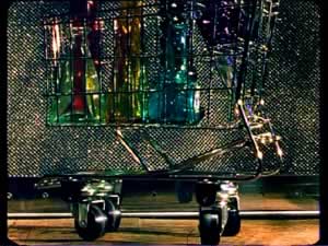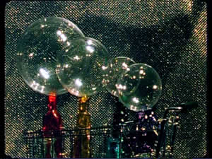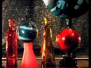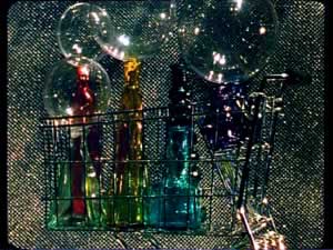 Glasflaschen, Styrokugeln und Schaumkarton mit Acrylmalerei, Plexiglaskugeln
