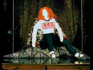Puppe aus weißem Stoff, Jeansstoff und Batikstoff, Stoffmalerei,