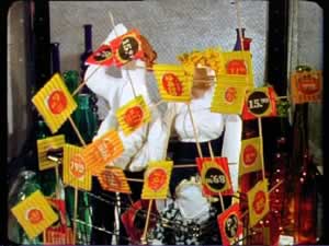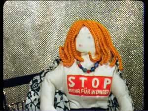 und Batikstoff, Stoffmalerei, Häkelschuhe und -haare, Glasperlen;