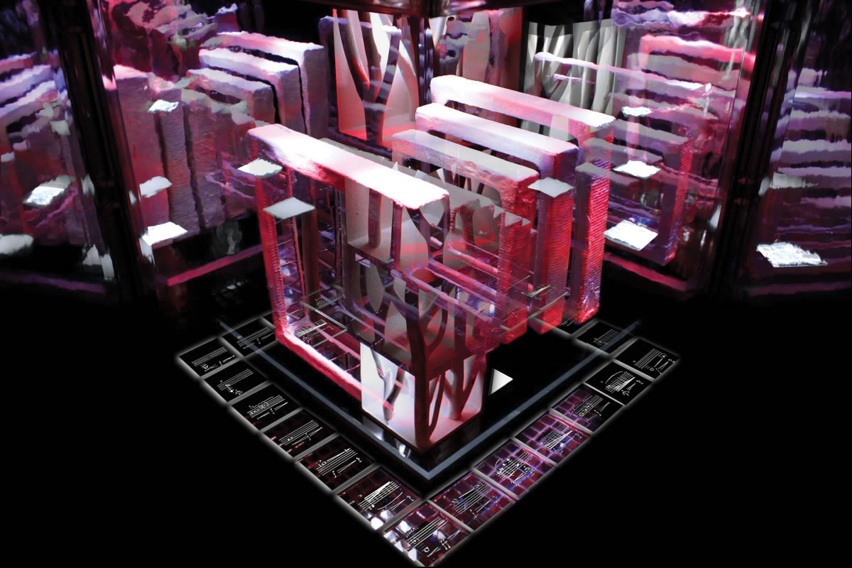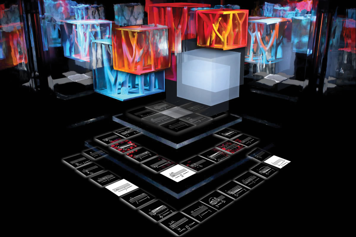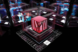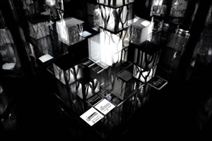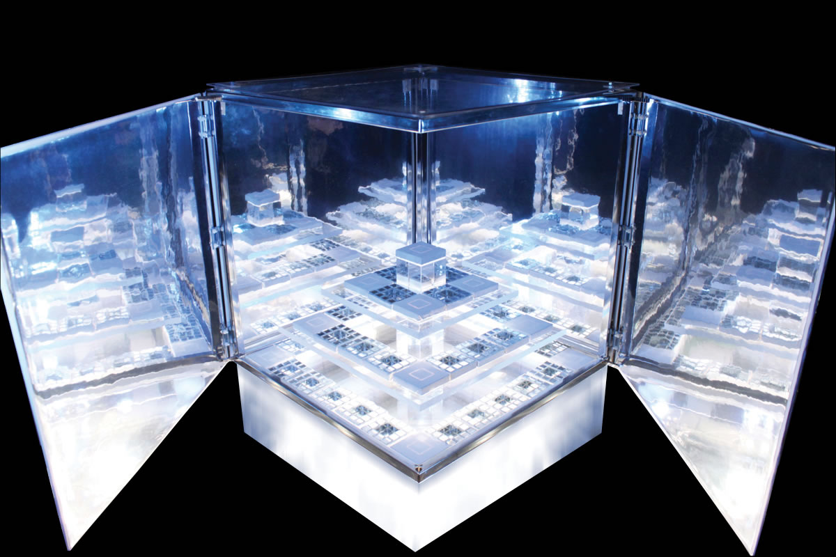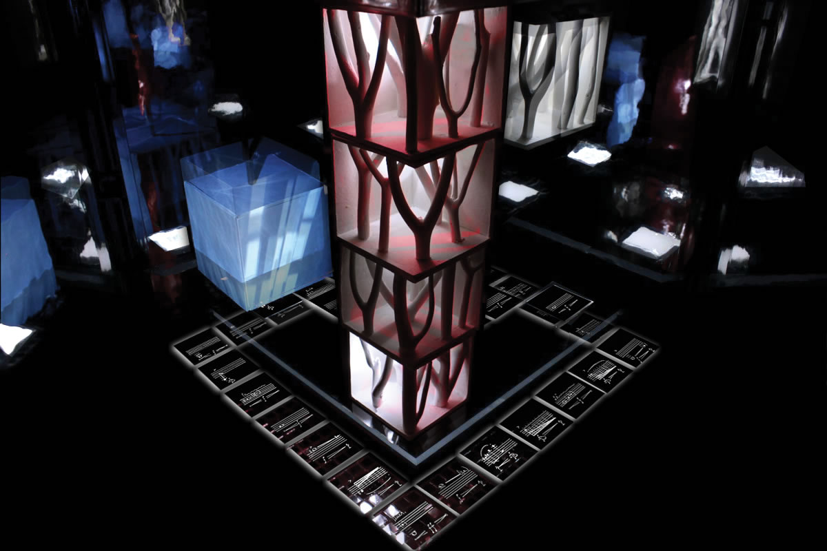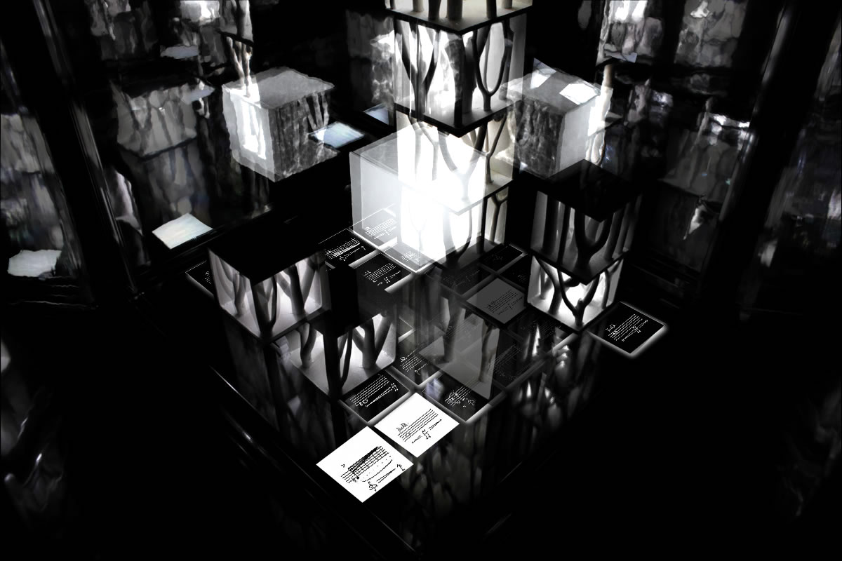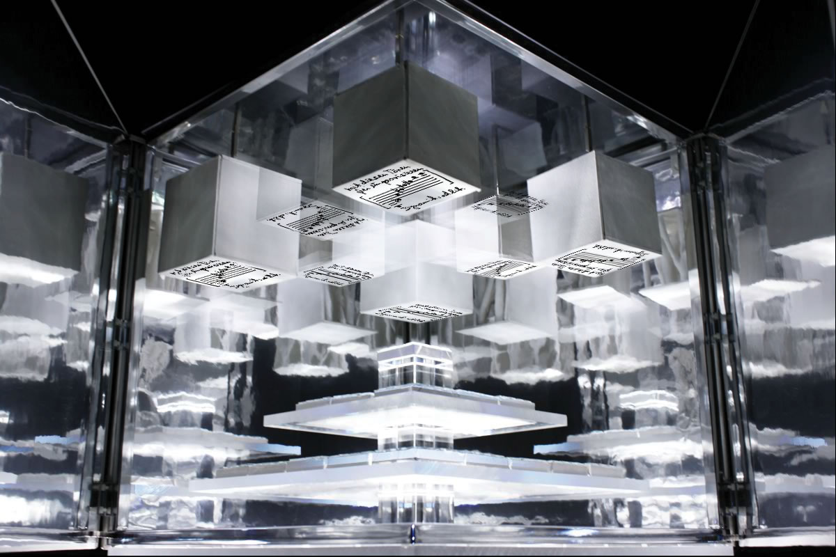 Der kubische KLANGGÄRTEN-Schaukasten, innen verspiegelt ins Unendliche, repräsentiert die unendlichen Möglichkeiten, die nonlineare Partitur 7x7 abzuspielen.